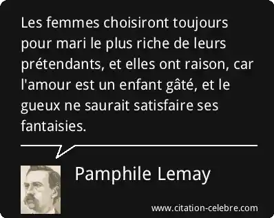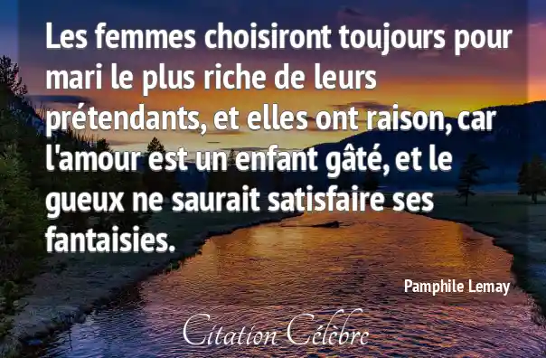 Les femmes choisiront toujours pour mari le plus riche de leurs prétendants, et elles ont raison, car l'amour est un enfant gâté, et le gueux ne saurait satisfaire ses fantaisies.