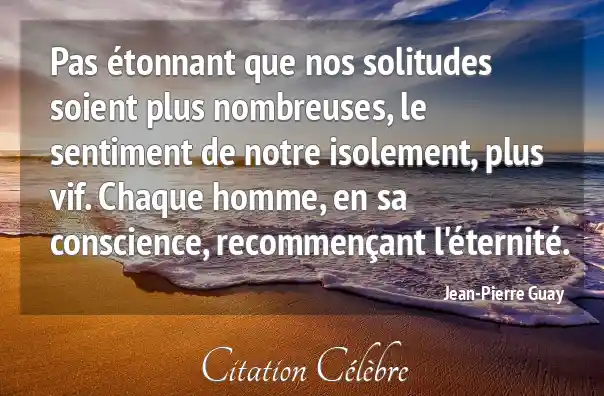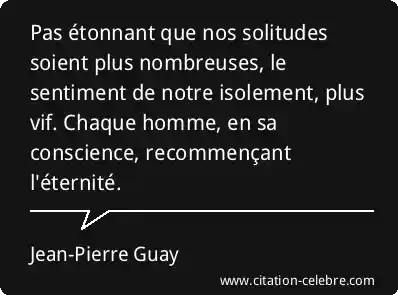 Pas étonnant que nos solitudes soient plus nombreuses, le sentiment de notre isolement, plus vif. Chaque homme, en sa conscience, recommençant l'éternité.