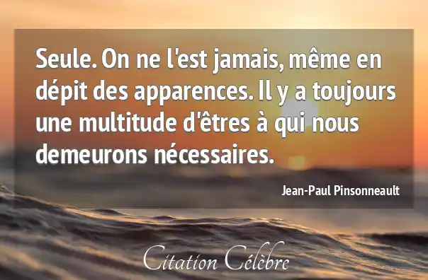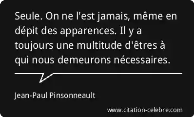 Seule. On ne l'est jamais, même en dépit des apparences. Il y a toujours une multitude d'êtres à qui nous demeurons nécessaires.