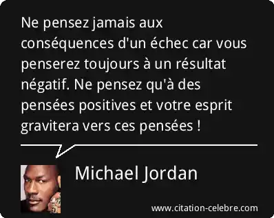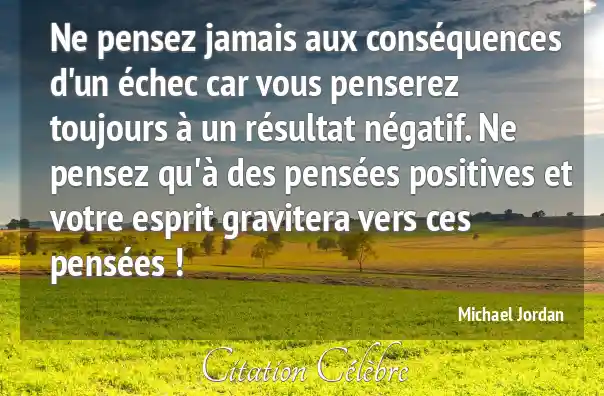 Ne pensez jamais aux conséquences d'un échec car vous penserez toujours à un résultat négatif. Ne pensez qu'à des pensées positives et votre esprit gravitera vers ces pensées !