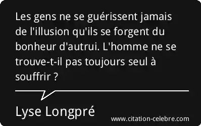 Les gens ne se guérissent jamais de l'illusion qu'ils se forgent du bonheur d'autrui. L'homme ne se trouve-t-il pas toujours seul à souffrir ?