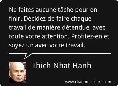 Ne faites aucune tâche pour en finir. Décidez de faire chaque travail de manière détendue, avec toute votre attention. Profitez-en et soyez un avec votre travail.
