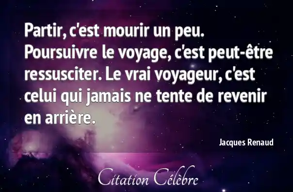 Partir, c'est mourir un peu. Poursuivre le voyage, c'est peut-être ressusciter. Le vrai voyageur, c'est celui qui jamais ne tente de revenir en arrière.