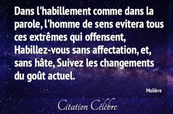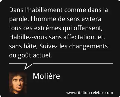 Dans l'habillement comme dans la parole, l'homme de sens evitera tous ces extrêmes qui offensent, Habillez-vous sans affectation, et, sans hâte, Suivez les changements du goût actuel.