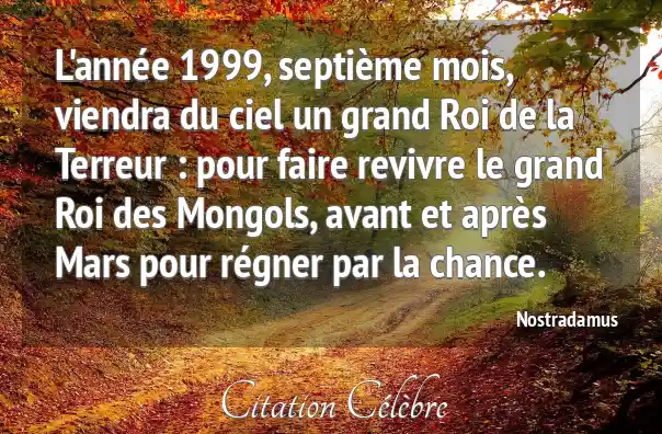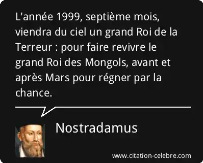 L'année 1999, septième mois, viendra du ciel un grand Roi de la Terreur : pour faire revivre le grand Roi des Mongols, avant et après Mars pour régner par la chance.