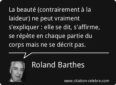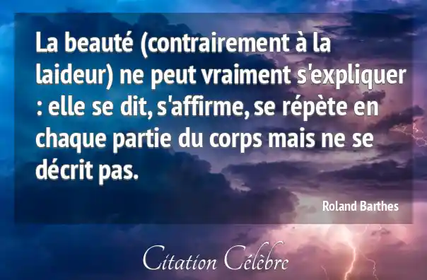 La beauté (contrairement à la laideur) ne peut vraiment s'expliquer : elle se dit, s'affirme, se répète en chaque partie du corps mais ne se décrit pas.