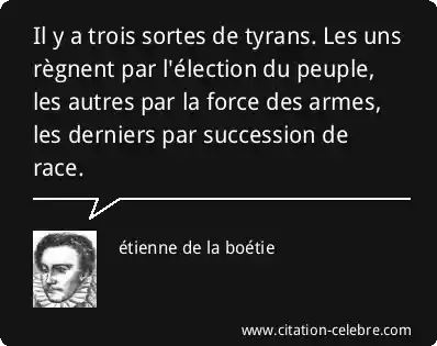 Il y a trois sortes de tyrans. Les uns règnent par l'élection du peuple, les autres par la force des armes, les derniers par succession de race.