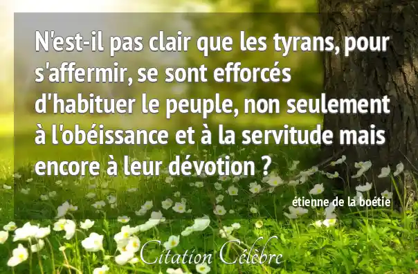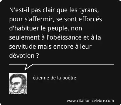 N'est-il pas clair que les tyrans, pour s'affermir, se sont efforcés d'habituer le peuple, non seulement à l'obéissance et à la servitude mais encore à leur dévotion ?