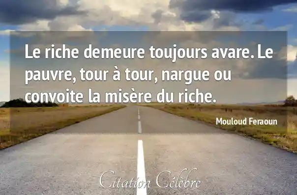 Le riche demeure toujours avare. Le pauvre, tour à tour, nargue ou convoite la misère du riche.