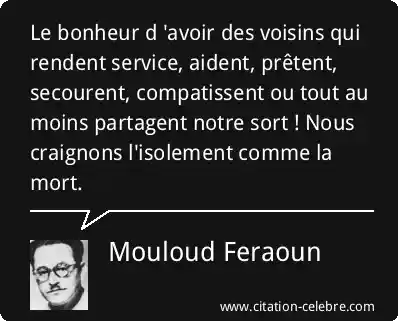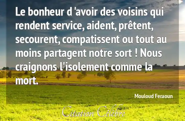 Le bonheur d 'avoir des voisins qui rendent service, aident, prêtent, secourent, compatissent ou tout au moins partagent notre sort ! Nous craignons l'isolement comme la mort.