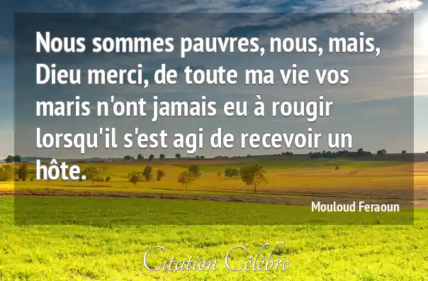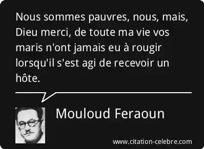 Nous sommes pauvres, nous, mais, Dieu merci, de toute ma vie vos maris n'ont jamais eu à rougir lorsqu'il s'est agi de recevoir un hôte.