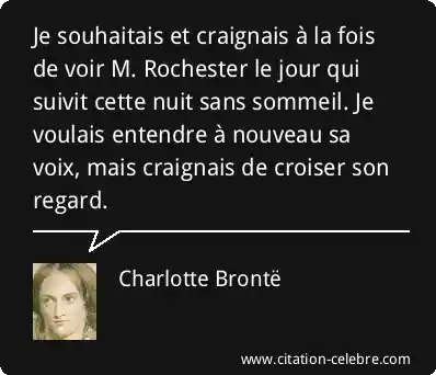 Je souhaitais et craignais à la fois de voir M. Rochester le jour qui suivit cette nuit sans sommeil. Je voulais entendre à nouveau sa voix, mais craignais de croiser son regard.