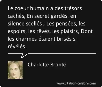 Le coeur humain a des trésors cachés, En secret gardés, en silence scellés ; Les pensées, les espoirs, les rêves, les plaisirs, Dont les charmes étaient brisés si révélés.