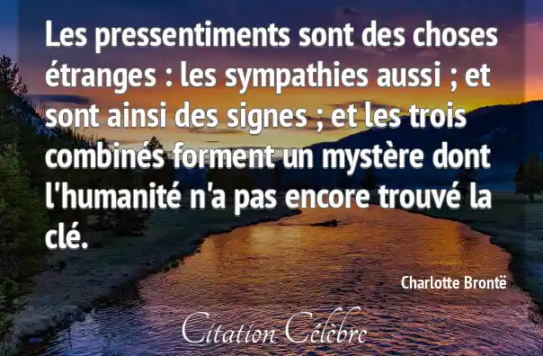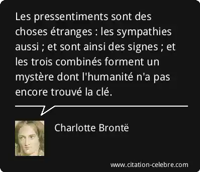 Les pressentiments sont des choses étranges : les sympathies aussi ; et sont ainsi des signes ; et les trois combinés forment un mystère dont l'humanité n'a pas encore trouvé la clé.
