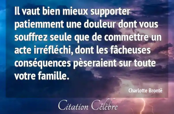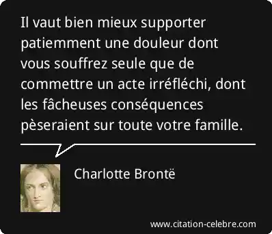 Il vaut bien mieux supporter patiemment une douleur dont vous souffrez seule que de commettre un acte irréfléchi, dont les fâcheuses conséquences pèseraient sur toute votre famille.