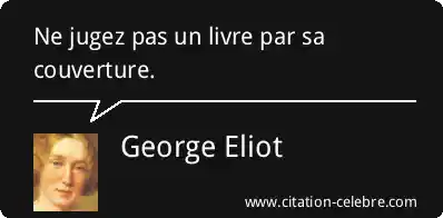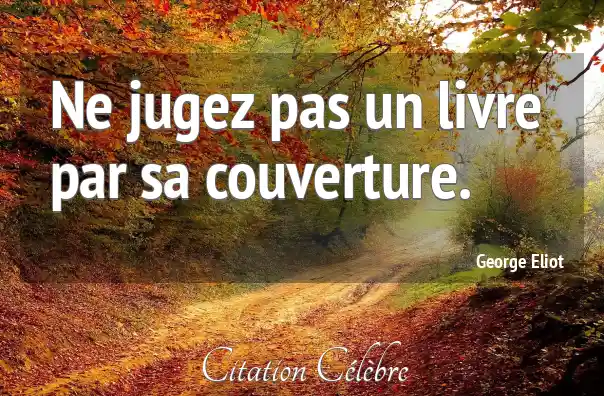 Cette célèbre expression, attribuée à George Eliot, signifie qu'il ne faut pas se fier aux apparences extérieures ou aux premières impressions pour juger de la valeur ou de la qualité de quelque chose ou de quelqu'un. La couverture d'un livre n'est qu'un élément superficiel qui ne révèle rien du contenu, de l'histoire, de la richesse du texte qu'il renferme.