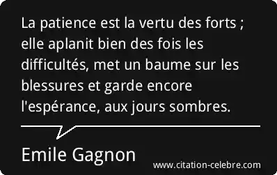 La patience est la vertu des forts ; elle aplanit bien des fois les difficultés, met un baume sur les blessures et garde encore l'espérance, aux jours sombres.