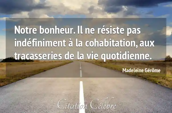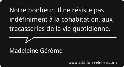 Notre bonheur. Il ne résiste pas indéfiniment à la cohabitation, aux tracasseries de la vie quotidienne.