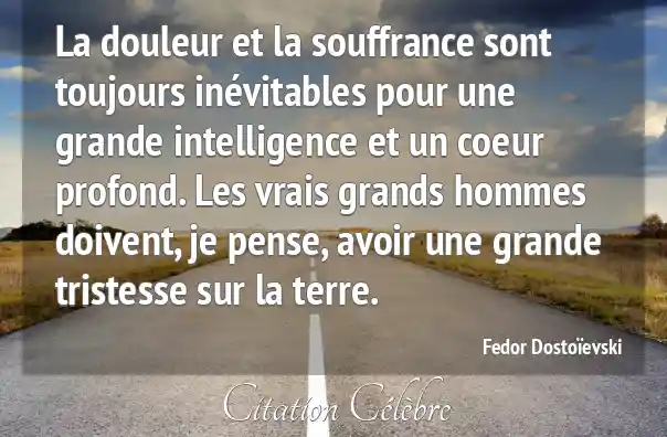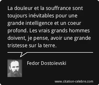 Cette citation exprime l'idée que la douleur et la souffrance sont des conséquences inévitables d'une grande intelligence et d'un coeur profond. Dostoïevski suggère que la capacité à comprendre profondément le monde (grande intelligence) et à ressentir intensément l'état d'autrui (coeur profond) conduit naturellement à une prise de conscience des tragédies et des imperfections de l'existence humaine, engendrant ainsi une grande tristesse chez les individus exceptionnels, qu'il appelle les "vrais grands hommes".