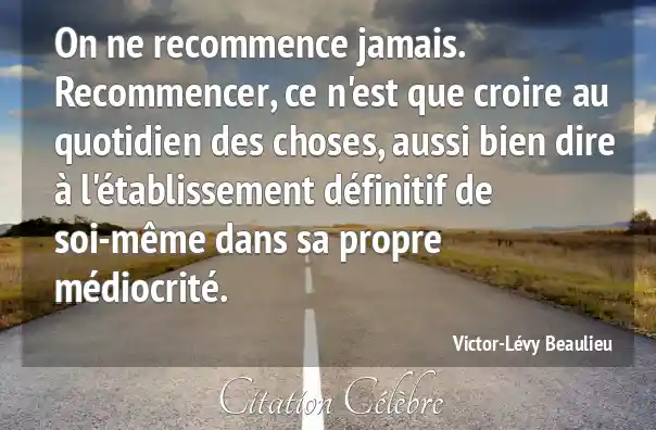 On ne recommence jamais. Recommencer, ce n'est que croire au quotidien des choses, aussi bien dire à l'établissement définitif de soi-même dans sa propre médiocrité.