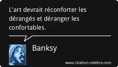 Cette citation exprime la fonction profonde et subversive que l'artiste Banksy attribue à l'art. Elle signifie que l'art ne doit pas se contenter d'être décoratif ou agréable. Il est censé exercer une double action :