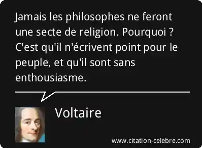 Jamais les philosophes ne feront une secte de religion. Pourquoi ? C'est qu'il n'écrivent point pour le peuple, et qu'il sont sans enthousiasme.