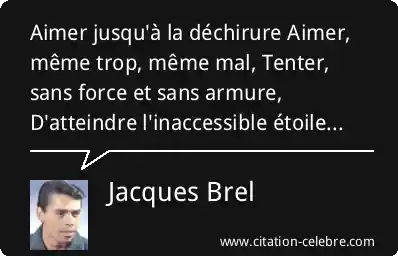 Aimer jusqu'à la déchirure Aimer, même trop, même mal, Tenter, sans force et sans armure, D'atteindre l'inaccessible étoile...
