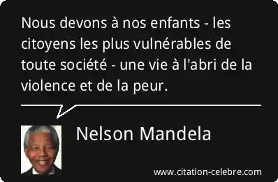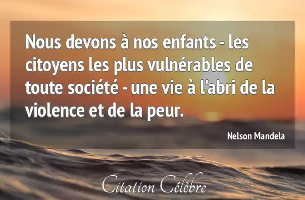 Cette puissante déclaration de Nelson Mandela souligne la responsabilité fondamentale de la société envers ses enfants. Le sens premier est un appel à garantir aux jeunes générations un environnement sûr et stable, où elles peuvent grandir sans être exposées à la brutalité ou à l'angoisse constante. Les enfants sont explicitement désignés comme les «citoyens les plus vulnérables», ce qui implique qu'ils méritent une protection et une attention maximales de la part des adultes et des institutions.