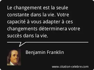 Cette célèbre citation, souvent attribuée à Benjamin Franklin, exprime une vérité fondamentale sur l'existence : l'impermanence. Elle affirme que tout dans la vie est en perpétuel mouvement et transformation. L'idée principale est que le changement est la seule chose qui ne change jamais. La seconde partie de la phrase met l'accent sur l'importance cruciale de la capacité d'adaptation : votre réussite n'est pas déterminée par la stabilité de votre environnement, mais par votre souplesse à naviguer et à réagir face aux inévitables évolutions.