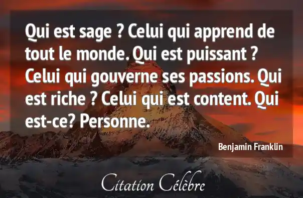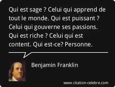 Qui est sage ? Celui qui apprend de tout le monde. Qui est puissant ? Celui qui gouverne ses passions. Qui est riche ? Celui qui est content. Qui est-ce? Personne.