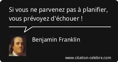 Cette célèbre formule de Benjamin Franklin signifie que l'absence de planification mène inéluctablement à l'échec. L'idée principale est qu'il ne suffit pas de désirer le succès ; il faut activement mettre en place des étapes et une stratégie pour l'atteindre. Ne pas se préparer, c'est adopter, de fait, une stratégie menant à la déroute. Pour réussir, la préparation est donc essentielle.