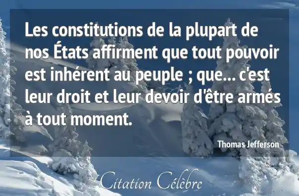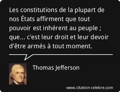 Les constitutions de la plupart de nos États affirment que tout pouvoir est inhérent au peuple ; que... c'est leur droit et leur devoir d'être armés à tout moment.