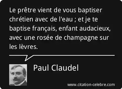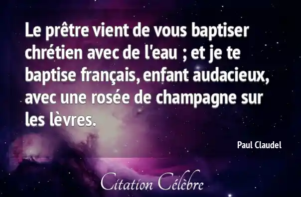 Le prêtre vient de vous baptiser chrétien avec de l'eau ; et je te baptise français, enfant audacieux, avec une rosée de champagne sur les lèvres.