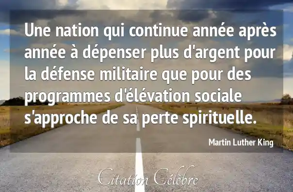 Une nation qui continue année après année à dépenser plus d'argent pour la défense militaire que pour des programmes d'élévation sociale s'approche de sa perte spirituelle.