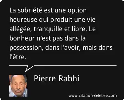 La sobriété est une option heureuse qui produit une vie allégée, tranquille et libre. Le bonheur n'est pas dans la possession, dans l'avoir, mais dans l'être.