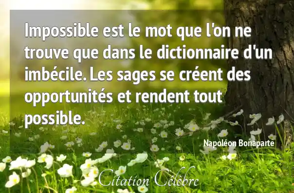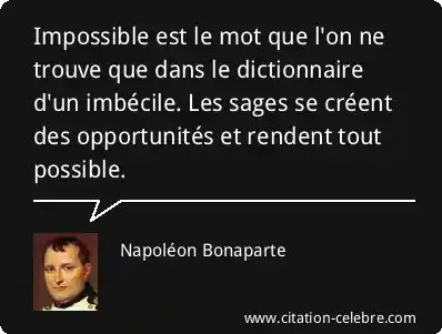 Impossible est le mot que l'on ne trouve que dans le dictionnaire d'un imbécile. Les sages se créent des opportunités et rendent tout possible.