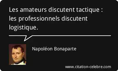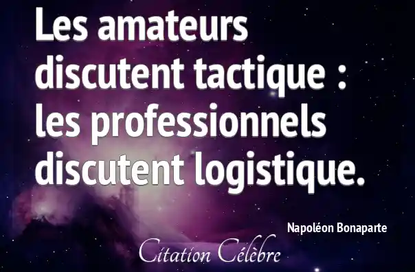 - Vocabulaire : La citation oppose deux termes clés : tactique (l'art de disposer et de manœuvrer les troupes sur le champ de bataille) et logistique (l'ensemble des moyens et méthodes relatifs à l'organisation d'un service, notamment le transport, le ravitaillement, l'hébergement).
