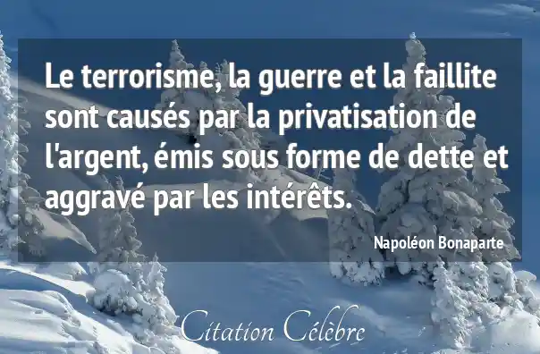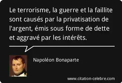 Le terrorisme, la guerre et la faillite sont causés par la privatisation de l'argent, émis sous forme de dette et aggravé par les intérêts.