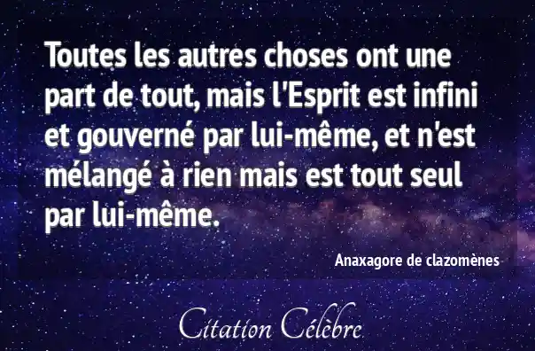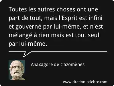 Toutes les autres choses ont une part de tout, mais l'Esprit est infini et gouverné par lui-même, et n'est mélangé à rien mais est tout seul par lui-même.