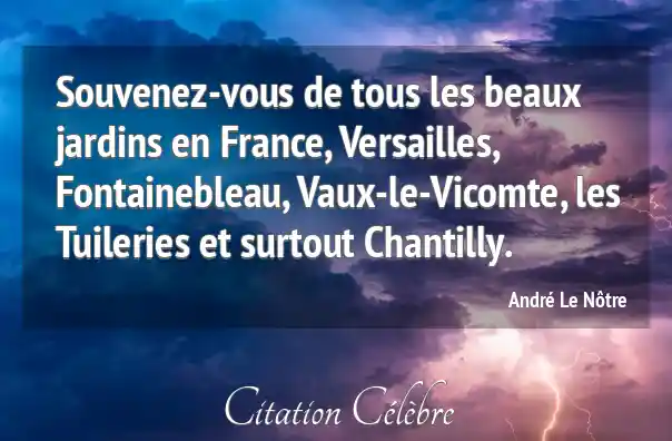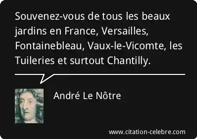 Souvenez-vous de tous les beaux jardins en France, Versailles, Fontainebleau, Vaux-le-Vicomte, les Tuileries et surtout Chantilly.