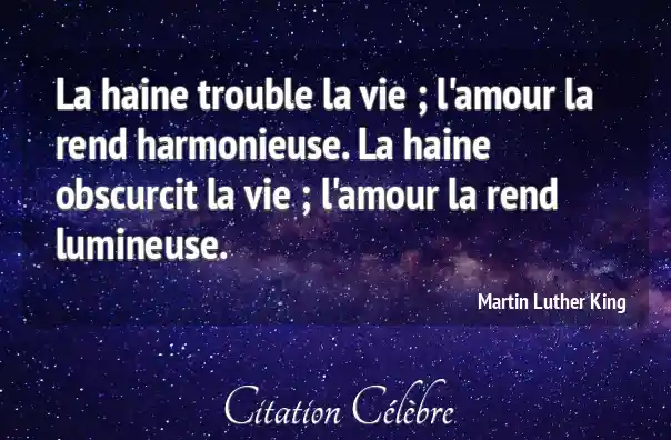 La haine trouble la vie ; l'amour la rend harmonieuse. La haine obscurcit la vie ; l'amour la rend lumineuse.