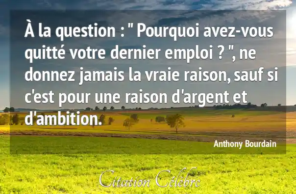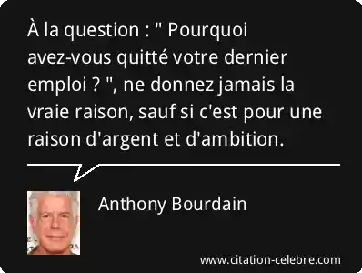 À la question : " Pourquoi avez-vous quitté votre dernier emploi ? ", ne donnez jamais la vraie raison, sauf si c'est pour une raison d'argent et d'ambition.