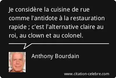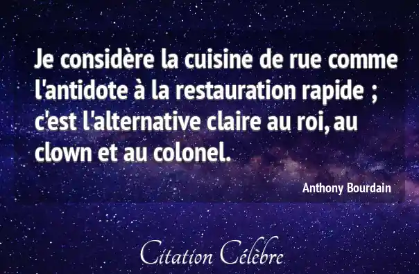 Je considère la cuisine de rue comme l'antidote à la restauration rapide ; c'est l'alternative claire au roi, au clown et au colonel.
