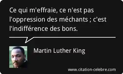 Cette puissante citation de Martin Luther King Jr. signifie que le plus grand danger pour la justice et la liberté ne réside pas dans les actions directes et manifestes des oppresseurs (les « méchants »), mais plutôt dans le manque de réaction, l'apathie et le silence des personnes qui se considèrent comme morales (les « bons »). En d'autres termes, l'inaction et le désintérêt face à l'injustice permettent à cette dernière de prospérer.