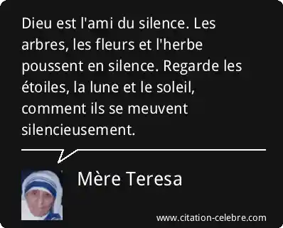 Dieu est l'ami du silence. Les arbres, les fleurs et l'herbe poussent en silence. Regarde les étoiles, la lune et le soleil, comment ils se meuvent silencieusement.