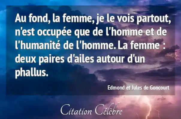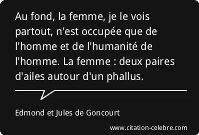 Au fond, la femme, je le vois partout, n'est occupée que de l'homme et de l'humanité de l'homme. La femme : deux paires d'ailes autour d'un phallus.