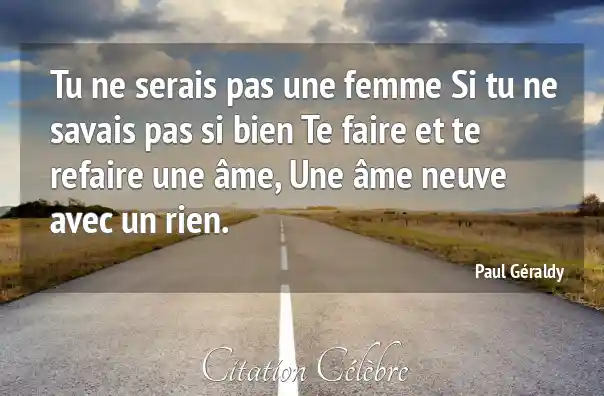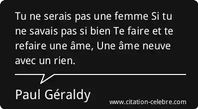 Tu ne serais pas une femme Si tu ne savais pas si bien Te faire et te refaire une âme, Une âme neuve avec un rien.