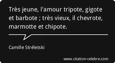 Très jeune, l'amour tripote, gigote et barbote ; très vieux, il chevrote, marmotte et chipote.