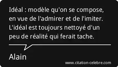 Idéal : modèle qu'on se compose, en vue de l'admirer et de l'imiter. L'idéal est toujours nettoyé d'un peu de réalité qui ferait tache.