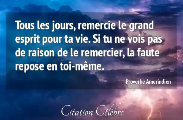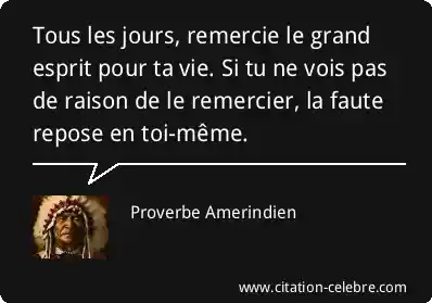 Tous les jours, remercie le grand esprit pour ta vie. Si tu ne vois pas de raison de le remercier, la faute repose en toi-même.